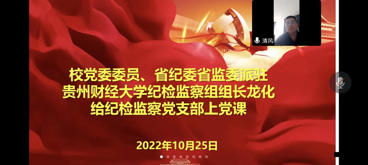 (法学院 杨兴莉报道|摄影 鄢铭蕙)10月25日下午,校党委委员、省纪委省监委派驻贵州财经大学纪检监察组组长龙化在参加十三届贵州省委第一轮巡视期间,通过腾讯会议为法学院研究生第一党支部、纪检监察党支部、国合处党支部上党课,党课主题为党史学习教育和党的二十大精神宣讲。