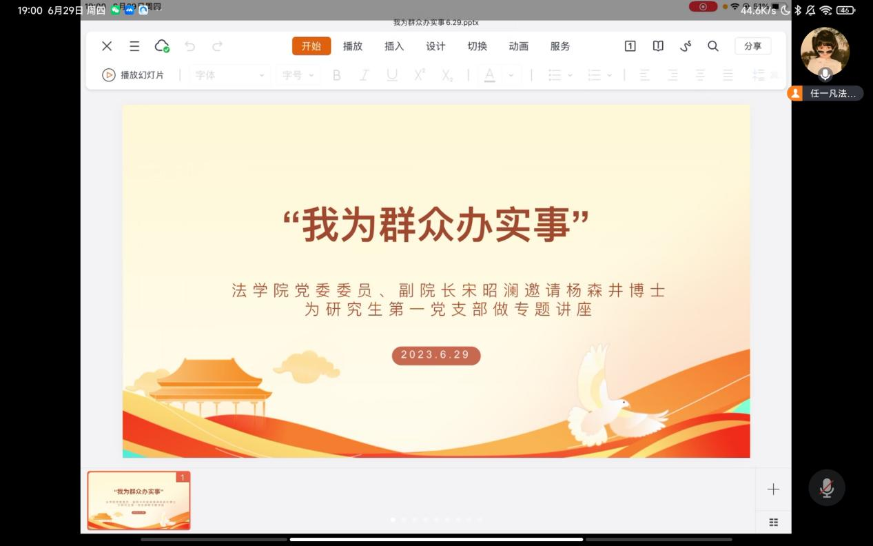 (法学院 图文/报道 田露丹)为解答学生对于论文写作的疑惑,2023年6月29日,联系研究生第一党支部的法学院党委委员、副院长宋昭澜邀请杨森井博士为党支部全体党员做“论文写作与学术研究”专题讲座,本次讲座通过线上腾讯会议的方式举行。