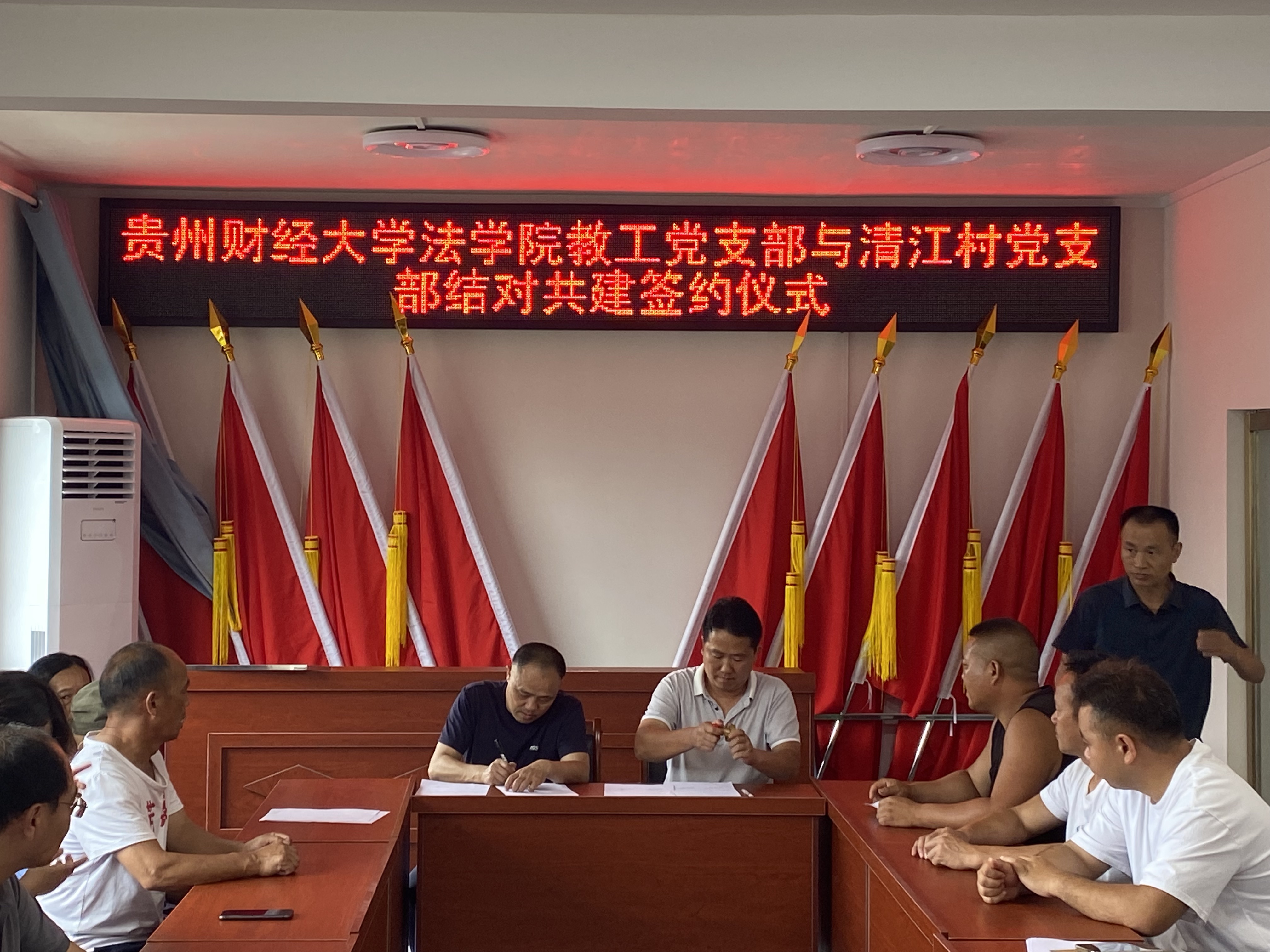 活动伊始,法学院党委与清江村村支两委、包括我院驻清江村第一书记李玉兰在内的驻村工作队开展座谈。清江村村支书陈世刚对法学院的到来表示欢迎,他介绍了清江村的村情民情等基本情况,希望法学院在民宿开发、苗族传统文化研学展销基地打造等方面给予支持。邵新顺表示将强化党建引领,与清江村党支部建立结对共建机制,发挥各自优势双向赋能,同时发挥法学院智力优势,为清江村的乡村振兴工作提供新思路、新方法。随后邵新顺与陈世刚共同为星空体育网站入口(中国)官方网站党员法律志愿服务站挂牌。曹务坤和陈世刚则围绕村民比较关心的婚姻家庭问题开展了题为《守护家庭权益 助力乡村振兴》的理论宣传二人讲,并现场回答了村民的相关困惑。曹务坤作为法学院教工第二党支部书记与陈世刚签署了党支部结对共建协议,两个支部将在支部建设、产业发展、法律援助与调解等方面开展合作。