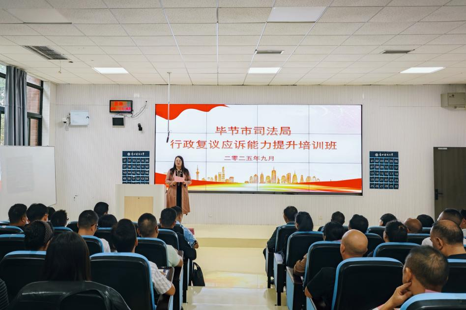 (法学院 王紫微 图文报道)为深入贯彻落实新时代全面依法治国战略部署,进一步提升毕节市行政执法人员的专业素养与履职能力,推动法治政府建设向纵深发展,9月23日,由毕节市司法局主办、星空体育网站入口(中国)官方网站承办的“毕节市2025年度行政复议应诉能力提升培训班”开营仪式在星空体育网站入口(中国)官方网站乐学楼阶101教室成功举行。毕节市司法局党组成员、副局长罗培栋,法学院党委书记邵新顺,法学院党委委员、副院长(主持工作)曹务坤,副院长宋昭澜,产教融合中心副主任王霖、任红出席,毕节市各行政部门 60 余名行政执法人员参加了开营仪式。仪式由宋昭澜主持。