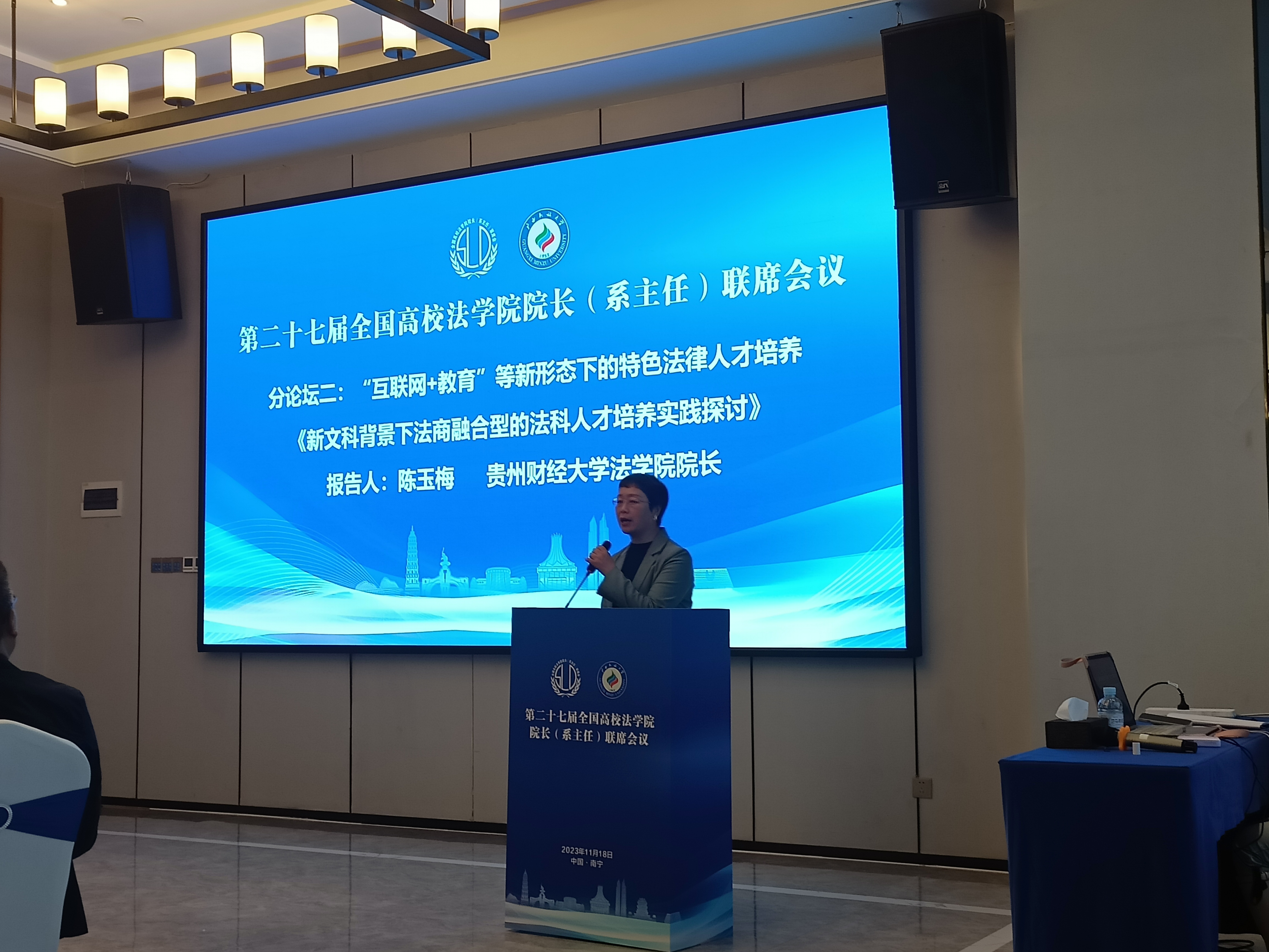 我院院长陈玉梅教授作为发言嘉宾,以《新文科背景下法商融合型的法科人才培养实践探讨》为题作报告,向在场嘉宾及专家汇报专业发展沿革、专业综合改革、专业建设成效及未来展望。她强调在新文科建设的大背景下,贵州财经大学法学教育将按照学校“一个中心、两大工程、三化同步”的战略目标,全面加强党建引领,围绕建设一流学科,以提高人才培养能力为中心,以提高教师能力与育人体系强化、治理体系和治理能力现代化为抓手,坚持学科交叉融合,继续锻铸“法商融合”型学科特色,团结带领法学院的全体师生,力争五到十年内建设成有特色、高水平的法学院。