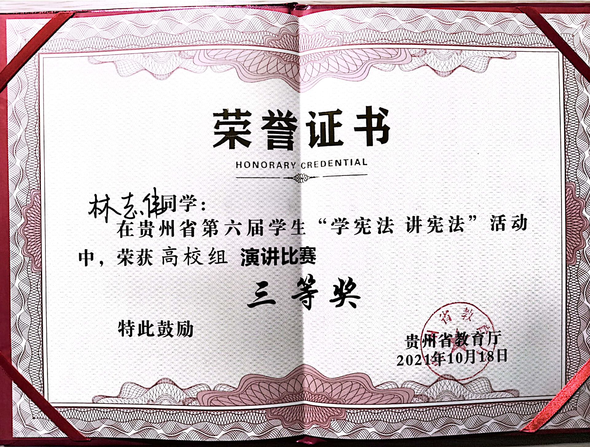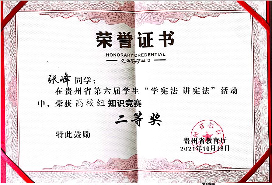 10月18日,由省教育工委、省教育厅主办,贵州民族大学承办的全省第六届学生“学宪法 讲宪法”活动总决赛在贵州民族大学举行,星空体育网站入口(中国)官方网站法学院学子张峰、林志伟经过多轮激烈比拼后,晋级总决赛,同来自全省各高校的参赛选手进行角逐。最终张峰同学荣获知识竞赛二等奖,林志伟同学荣获演讲比赛三等奖。