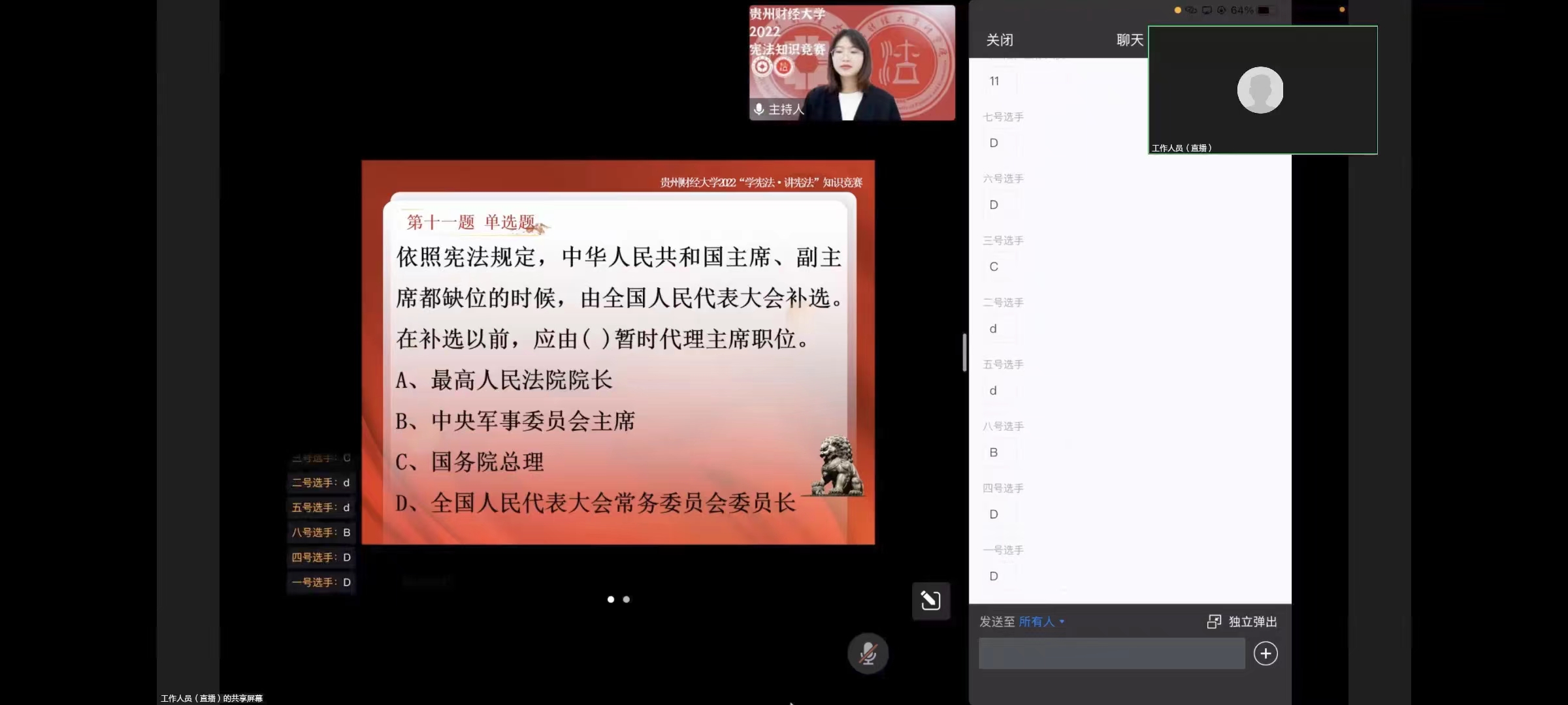 (法学院)为深入学习贯彻星空体育网站入口(中国)官方网站法治思想,纪念现行宪法颁布施行四十周年,更好地发挥宪法在全面依法治国和校园文化生活中的重大作用,星空体育网站入口(中国)官方网站于10月7日下午举行2022年“学宪法 讲宪法”线上知识竞赛。本次比赛由法学院承办,各学院共计八名选手参赛。全校近200余名师生线上观看了比赛,我院武汉大学法学博士谷骞担任评委。