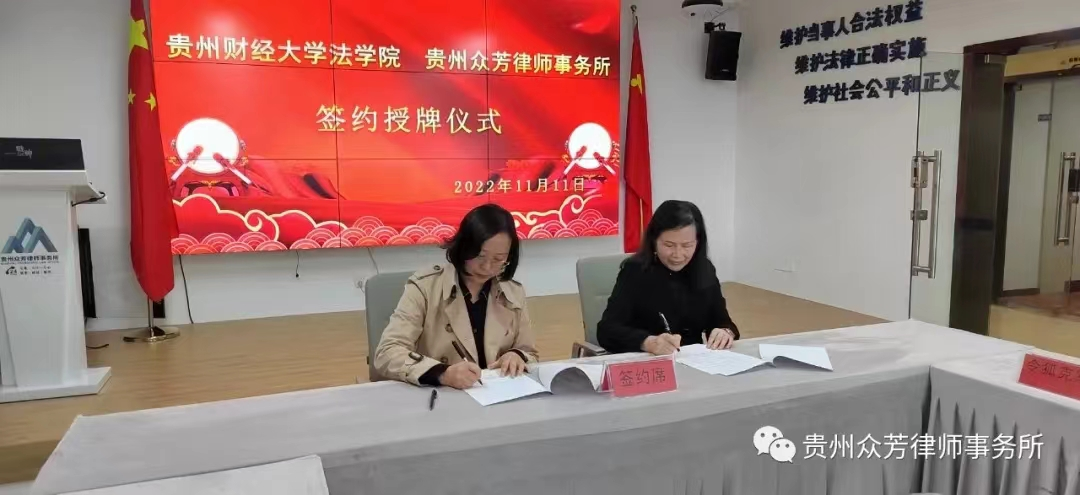 授牌仪式现场,星空体育网站入口(中国)官方网站和贵州众芳律师事务所签订了《实践教学基地合作协议》。今后,双方将进行全方位、多层次的深入合作,包括互相提供平台,互派人员交流,建立学习、培训和交流机制,共同进行律师事务及律师业务发展方面的理论研究和课题研究。