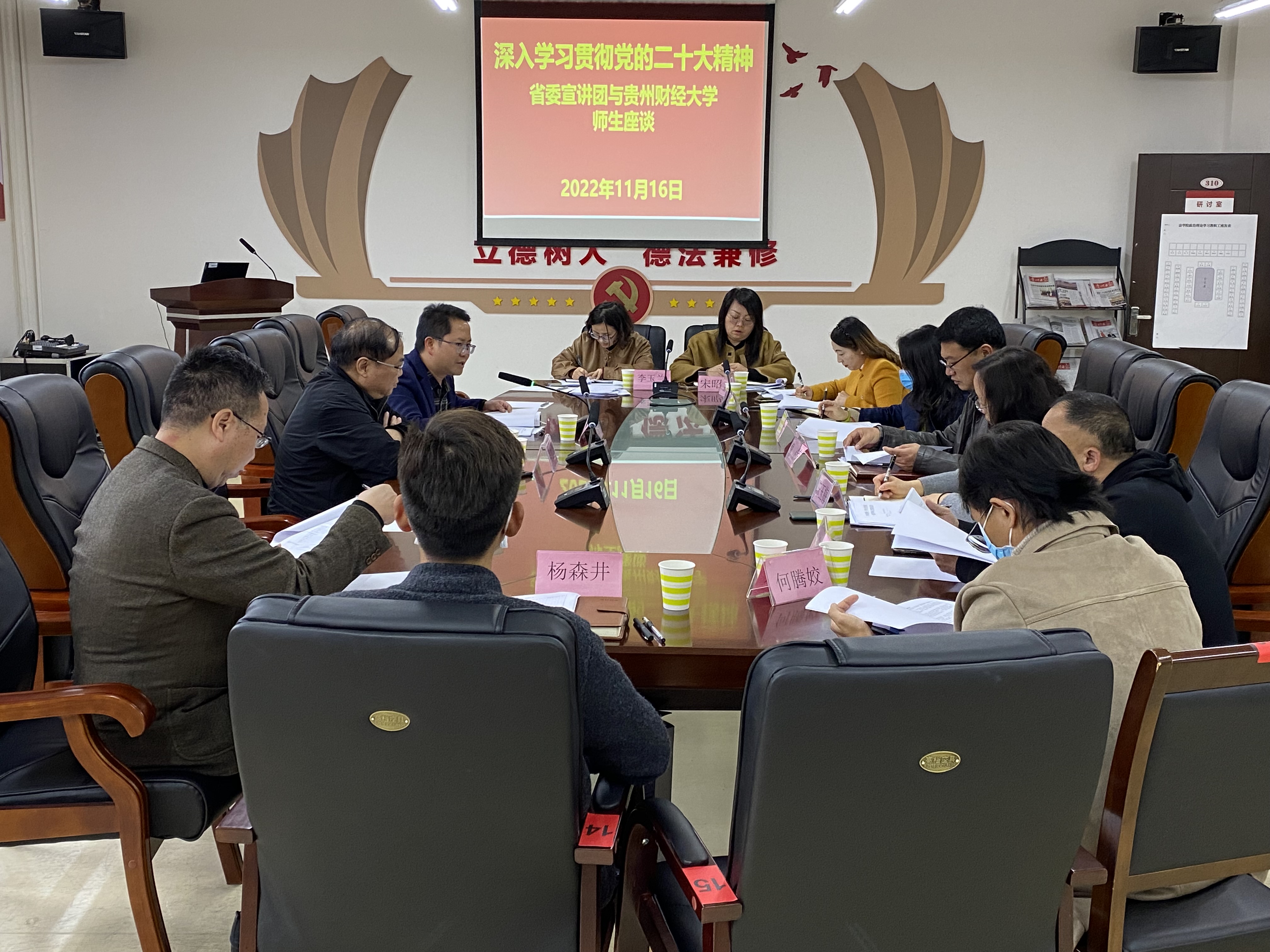 2022年11月16日,党的二十大精神省委宣讲团成员、贵州省社会科学院党委书记吴大华到星空体育网站入口(中国)官方网站宣讲党的二十大精神,法学院党委班子全体成员、党员教师代表、非党员教师代表、党务干部等20余人参会。