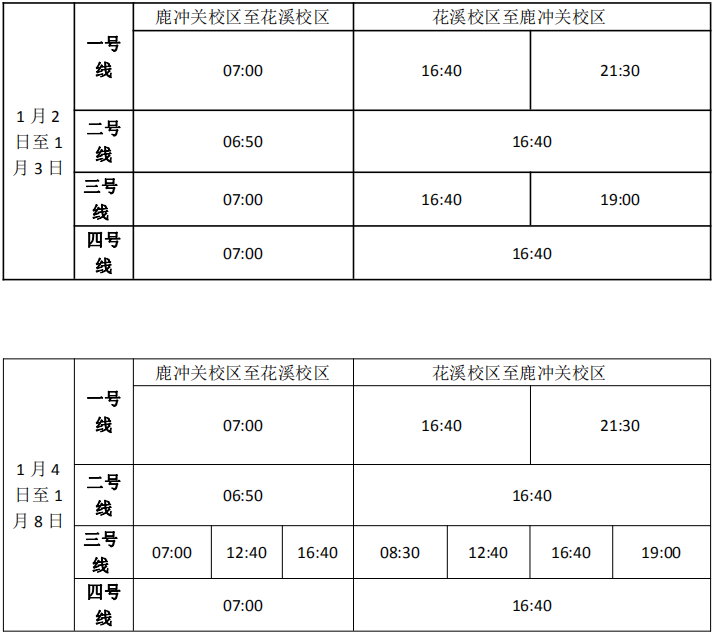 按照学校统一安排,星空体育网站入口(中国)官方网站鹿冲关校区、花溪校区进入期末考试阶段, 1月8日考试结束,为满足期末考试需要和行政科研工作的开展,现对交通车作如下调整:
